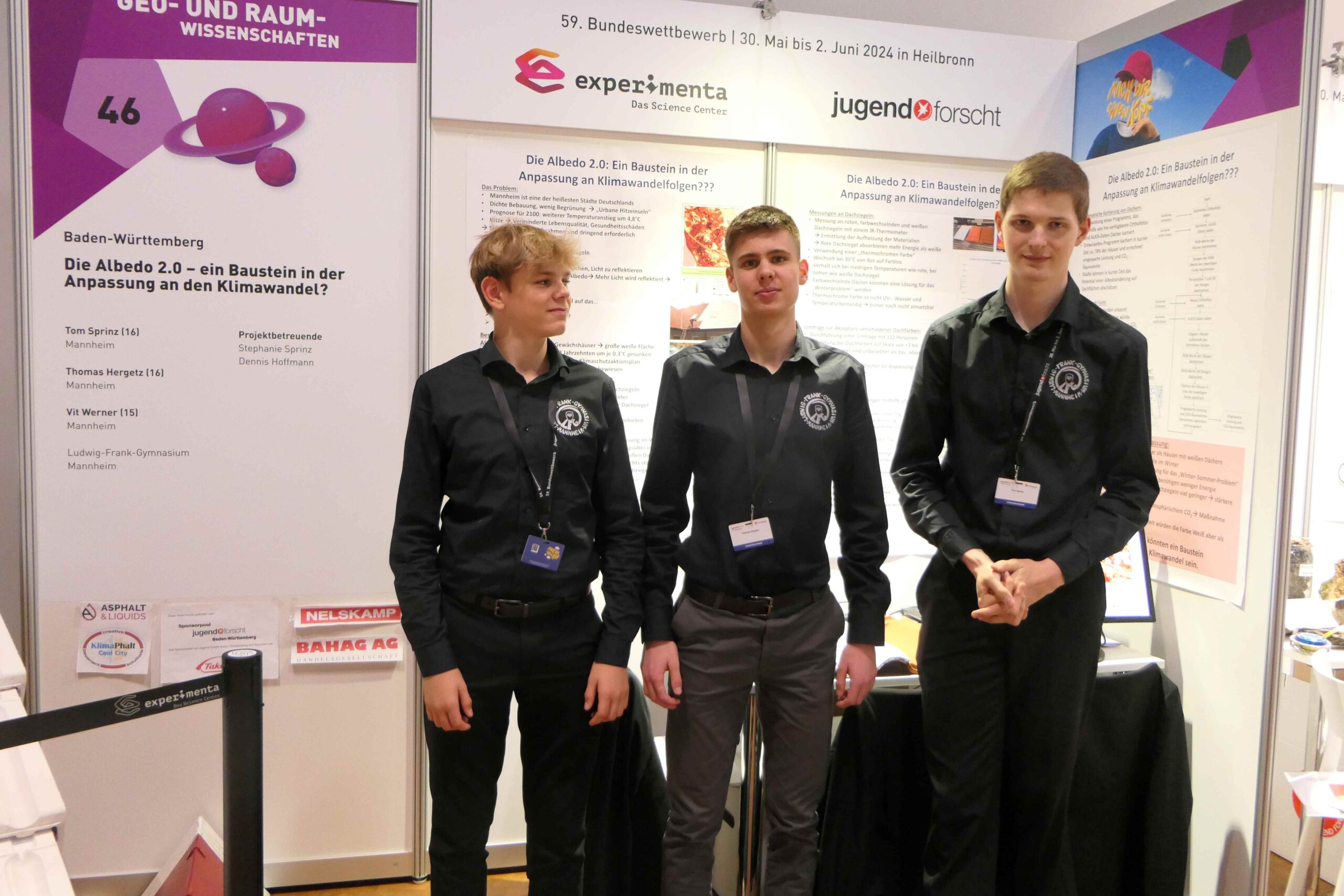 Tom Sprinz, Thomas Hergetz und Vit Werner (Ludwig-Frank-Gymnasium, Mannheim) wiesen in ihrer Arbeit „Die Albedo 2.0 – ein Baustein in der Anpassung an den Klimawandel?“ auf die Tatsache hin, dass je heller eine Fläche ist, desto weniger erwärmt sie sich bei Sonneneinstrahlung. Aus diesem Grund untersuchten sie an selbst konstruierten Modellhäusern, in welchem Maße sich die Farbe von Dachziegeln auf die Innentemperatur eines Gebäudes auswirkt. Bei ihren Messungen lag die Temperatur in einem Haus mit weißen Dachziegeln im Durchschnitt knapp 1° Celsius niedriger als bei einer konventionellen Ziegelfarbe. Diese Ergebnisse rechneten die drei Jungforscher anschließend auf mehrere Mannheimer Stadtteile hoch, indem sie zunächst die Gesamtheit der Dachflächen bestimmten. Dann berechneten sie die Energiemenge, die im Untersuchungsgebiet pro Jahr bei weißen Dachbelägen weniger absorbiert werden würde. Das könnte Architekten künftig dazu anregen, bei Dächern hellere Baustoffe zu verwenden. Ein Problem stellen dabei die derzeit gültigen Bauvorschriften dar. Sie müssten geändert werden, so wie das in Teilen Kaliforniens bereits geschehen ist.