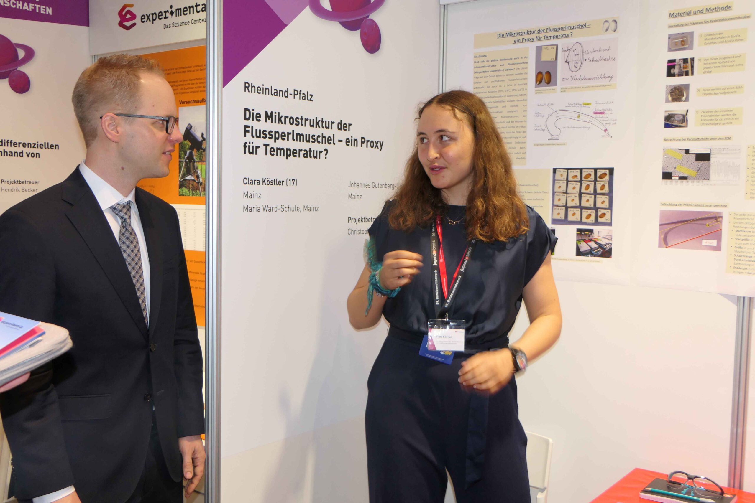 Den 3. Platz in der Gesamtwertung der Sparte Geo- und Raumwissenschaften belegte Clara Köstler (Maria Ward-Schule, Mainz/Rheinland-Pfalz) mit ihrer Arbeit „Die Mikrostruktur der Flussperlmuschel – ein Proxy für Temperatur?“ Die Jungforscherin ging dabei von der Tatsache aus, dass manche Strukturen der Flussperlmuschel in der Forschungsliteratur als Indiz für die Wassertemperatur gewertet werden, die während der Lebenszeit der Tiere herrschte. In besonderem Maße gilt die Dicke der Perlmuttplättchen der ozeanischen Muschel als ein derartiger Indikator. Die Jungforscherin untersuchte Muschelschalen von Tieren, die zuvor in unterschiedlichen, aber konstant temperierten Aquarien gelebt hatten. Bei ihren Analysen, die sie mit einem Rasterelektronenmikroskop durchführte, standen neben der Dicke der Perlmuttschicht auch die Mikrostrukturen der Prismen in der äußersten Schalenlage im Mittelpunkt des Interesses. Dabei fand die Jungforscherin heraus, dass es zwar keinen direkten Zusammenhang der Strukturen mit der Wassertemperatur gibt; allerdings lohnen sich aufgrund von Hinweisen auf jahreszeitliche Muster in der Schale weitere Strukturanalysen.