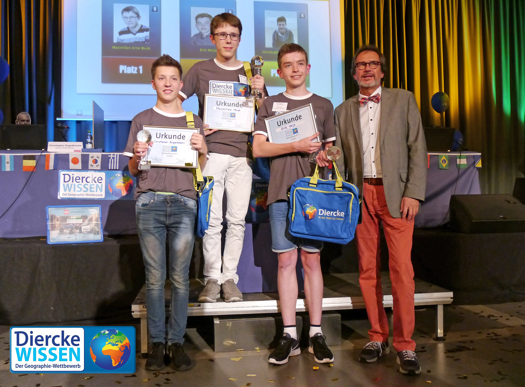Bei dem Wettbewerb „Diercke Wissen“ stellen die Schülerinnen der Klassen 7 bis 10 ihr Wissen zu physisch-geographischen und humangeographischen Schwerpunkten unter Beweis. Über die Ebenen der Klassen, der Schulen und des Bundeslandes werden die 16 Teilnehmenden für den jährlichen Bundesausscheid ermittelt. Hinzu kommt eine weitere Teilnahmemöglichkeit für die/den Beste/n der deutschen Auslandsschulen. Auf Schulebene können auch die Schülerinnen und Schüler der Klassen 5 und 6 ihr Geographiewissen mit dem Fragebogen WISSENs-Junior nachweisen.